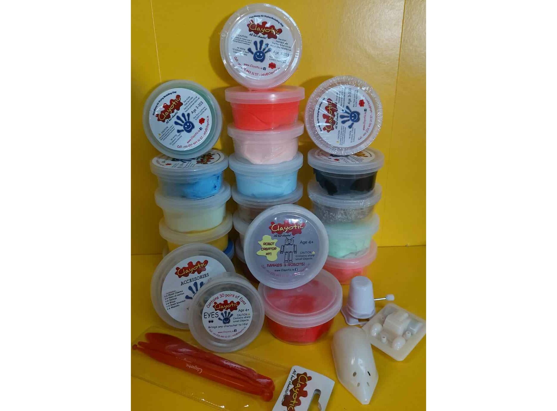 our 18 Air Dry Clay colours in 95g/250ml tubs with additional primary colours (Black, White, Red, Yellow & Blue) with 120 pairs of eyes and 5 tools sets.