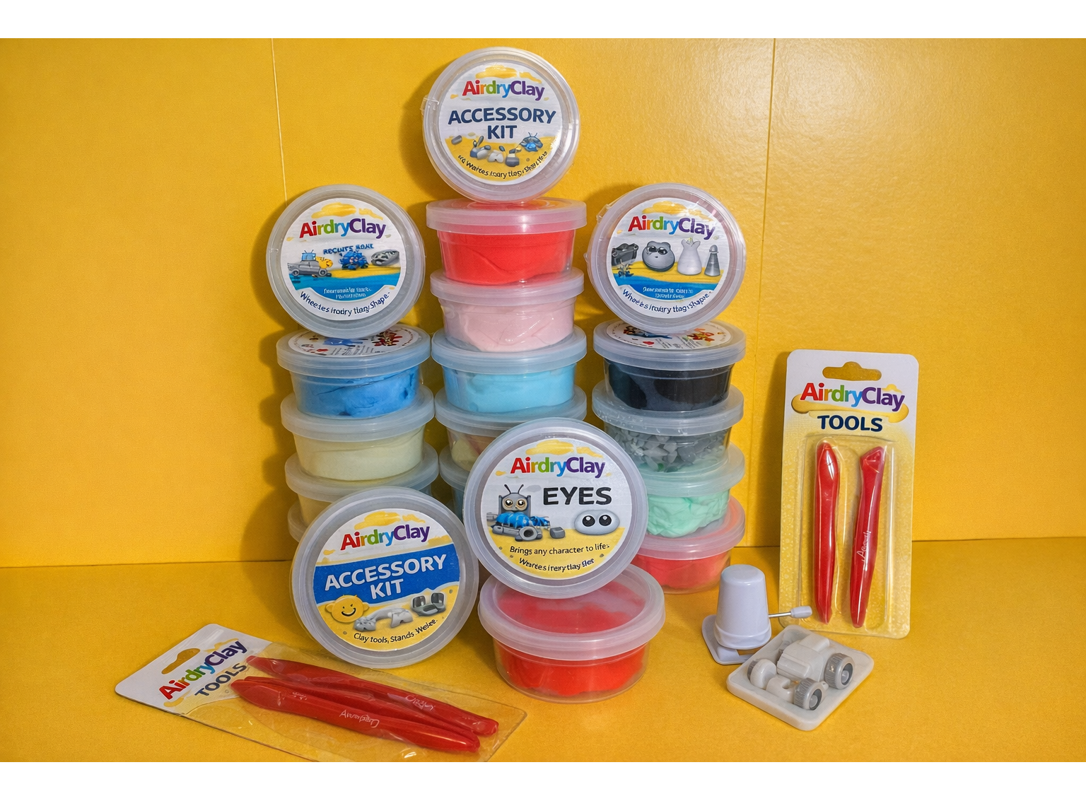 our 18 Air Dry Clay colours with all accessories in 250ml tubs.